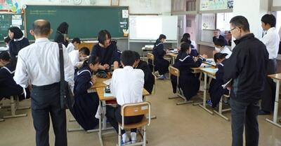 写真は研究授業の様子です。たくさんの先生方の囲まれ、生徒はちょっと緊張気味でしょうか?