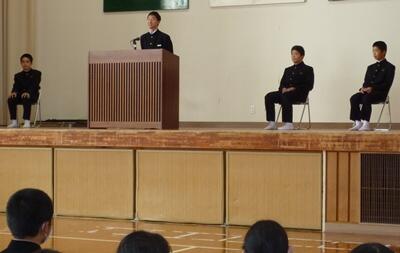 本日の朝は、部活動生集会を実施しました。写真は、担当の先生からの話の後に、キャプテン会の会長である、卓球部の黒木さんが話をしているところです。