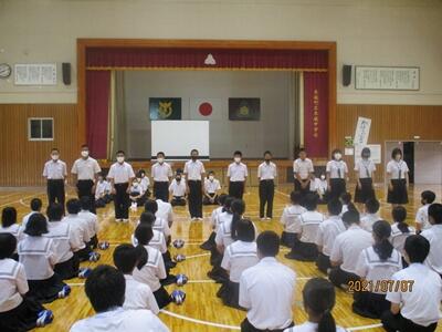 今年の夏休みは新型コロナウイルス感染症の影響で、登校日も中止、部活動も中止になるなど、我慢の夏休みでした。このような状況から、始業式は放送で行いました。マスクの着用、手指の消毒、換気をさらに徹底させ、新型コロナウイルス感染症拡大防止に努めていきます。