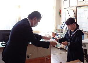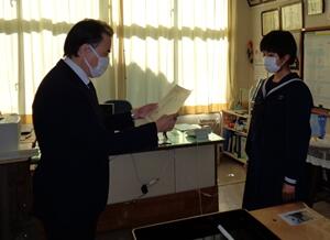 2年生篠原さんが宮崎県租税教育推進中央協議会会長賞銅賞を、同じく2年生德田さんが西都・児湯地区租税教育推進協議会会長賞銀賞を受賞しました。先日高鍋税務署の宮本署長と横山係長が来校され、直接表彰状を手渡していただきました。2人ともとても素晴らしい内容の作文でした。