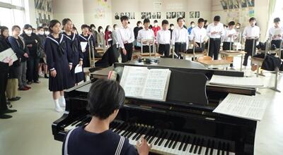 最初に、中学校の授業の様子を見学してもらいました。写真は、上が中1の英語の授業、下が中2の音楽の授業の様子です。