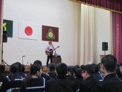 続いて行われた記念講演では、高原町出身のシンガーソングライターの大野勇太さんが自作の歌を披露しながら、「夢を形に」という演題でお話しをしてくださいました。「夢を持ったら口に出して言おう」「周りの人に感謝の心を持とう」という言葉が心に残りました。また、話の合間の歌も素晴らしく、心に響くものでした。