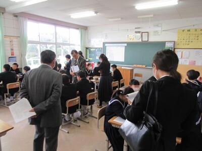 本日の午後、1年A級で学級活動の研究授業がありました。この授業は、宮崎大学の先生方のご協力を得て実施されたもので、木城町の恵利教育長にも参観していただきました。担任の福山先生と生徒たちは、たくさんの先生方に見られながらの授業で緊張感もありました。しかし、「2年生になったらどんな先輩になりたいか」という学習課題にグループで話し合い、しっかり発表していました。