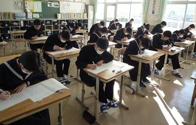 3年生は今日から2日間、最後の実力テストです。写真は理科のテストの様子です。みんな頑張っています。予防のためにマスク着用でがんばっている生徒もいますね。