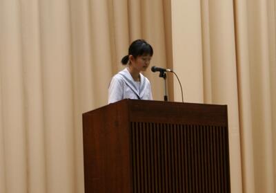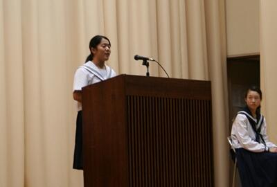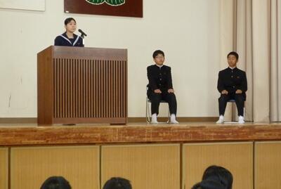 式では、最初に1年生の橋本君、2年生の溝部君、生徒会執行部代表で山田さんが、それぞれに1年を振り返ってくれました。写真は山田さんの発表の場面です。