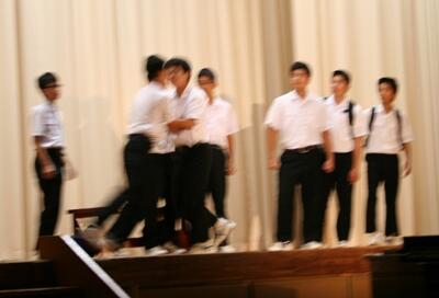 午後は3年生の劇からのスタートです。中3生の、進路についての悩みを劇にしてくれました。写真は、ちょっとした気持ちの行き違いからけんかになりそうな場面です。迫真の演技で、ついついカメラもぶれてしまいました。すみません。