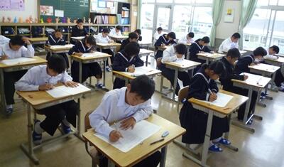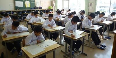 2学期も折り返し地点に来ました。体育大会、文化祭と大きな行事をがんばった前半でしたが、勉強面でもがんばらなければなりません。生徒たちは、朝から真剣にテストに取り組みました。写真は上から順に、1・2・3年の様子です。教科はいずれも社会科のテストです。