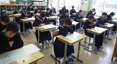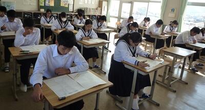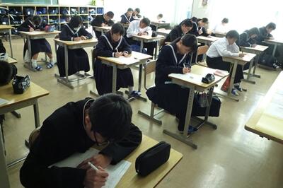 本日の2校時、1年生を対象に県英テストが行われました。これは、県内の中学校で一斉に行われるもので、英語力がどの程度身に付いているかを確かめるためのテストです。写真は、テストに真剣に取り組む1年A級の生徒たちの様子です。