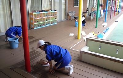 めばえ保育園では、子どもたちがお昼寝中に、廊下などの清掃をしました。