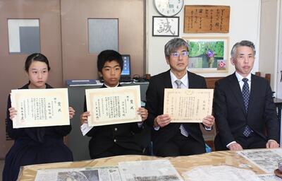 税についての作文のコンクールがあり、本校から1年の三輪さんと谷岡君が銅賞に入選したことは、学校だよりでもお伝えしましたが、本日、高鍋税務署の方が見えて、その伝達と表彰式を校長室で行い、最後に記念撮影をしました。