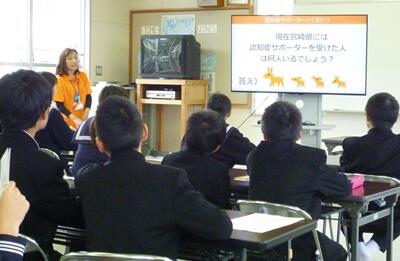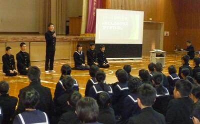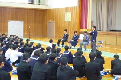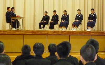 本日来てくださったのは、本校出身で、先日高校を卒業したばかりの先輩方です。宮崎日大高校から竹崎君、高鍋高校から木下さん、宮崎工業高校から富岡さん、西都商業高校から守部君の4名の皆さんが来てくれて、中学時代の話しや高校での話しなどをしてくれました。