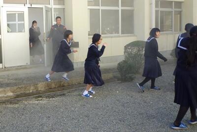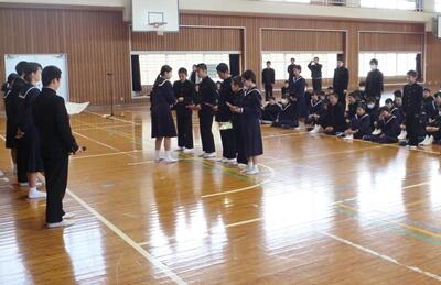 式では、転出される先生方からお一人お一人言葉をいただいた後、代表で2年生の中武さんがお礼の言葉を述べました。花束贈呈の後、校歌を全員で歌いました。