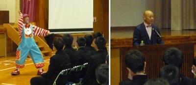 次に、A1グランプリ(あいさつの励行についての生徒会の取組)について報告がなされました。写真は、あいさつがよかったとして、今回初めて表彰された人に記念品が贈られているところです。