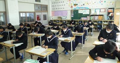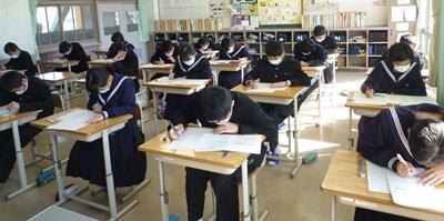 本日から3日間、2学期末テストが実施されます。今日は日差しも弱く、ぐっと冷え込んだ一日となりましたが、生徒たちは、テストに真剣に取り組んでいます。写真は上から1年生と2年生の理科のテスト、3年生の英語のテストの様子です。