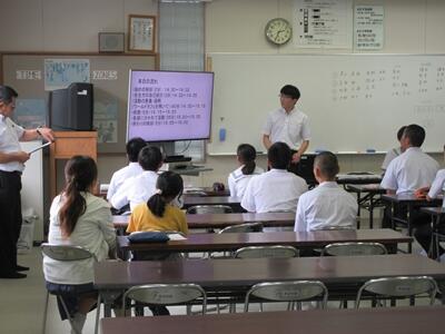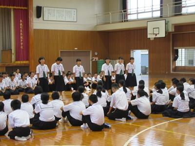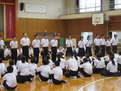 体育館では、生活環境委員会が、熱中症についての注意事項等をプレゼンを使って分りやすく説明してくれました。まだまだ暑い日が続きますので、たいへん参考になりました。また、全校体育では、元気のよいかけ声が聞かれ,行進や応援の練習をしました。