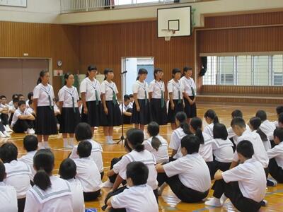 始業式後、夏休みに行われた生徒会リーダー研修会の報告がありました。それぞれの学年や学校の課題をリーダーたちが話し合い、これから努力していくことなどを発表してくれました。