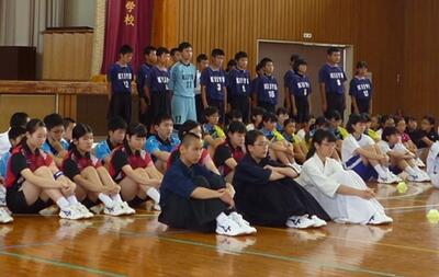 大会に参加する選手たちが入場した後、生徒会長の大橋君から激励の言葉があり、各部・クラブごとに、大会に望む意気込みを述べてくれました。写真はサッカー部が抱負を述べているところです。
