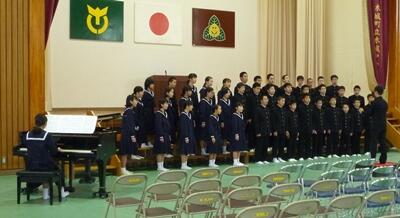 その後、詩の群読や合唱を行いました。写真は合唱の様子です。曲はアンジェラ・アキさんの「手紙」です。式では、一人一人の生徒が、これからの人生における決意の言葉を漢字1文字で表し、その文字についての自分の思いを述べました。