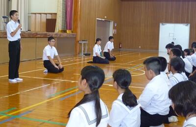 式では、1年生から江口さん、2年生から谷岡君、3年生から飯干さん、生徒会執行部から2年生の中下君が、代表で2学期の抱負を述べてくれました。写真は、中下君の発表の様子です。