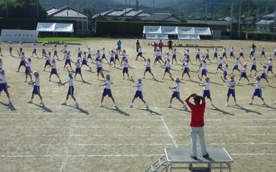 今日は、ラジオ体操、退場の隊形確認の後、福智王の練習を中心に行いました。学年ごとに体育の時間で1時間だけ練習しましたが、全体であわせるのは今回が初めてです。今年も、地域の指導者の長友さんに教えていただきました。