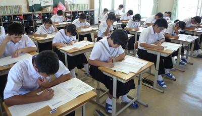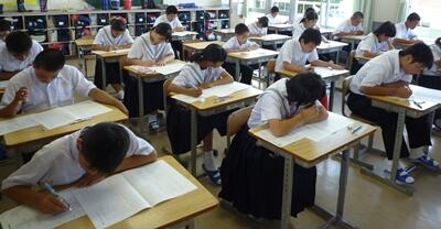 課題テストは、夏休みの課題の内容を中心に出題されます。夏休みの課題にどれだけ真剣に取り組んだかが問われます。3年の実力テストは、入試に向けた模擬テストです。今回で3回目となります。こちらも、夏休みにはじめに行われた三者面談で話し合った目標の進路に、どれだけ近づくことができたかを判断するテストとなります。写真は、上から1年性、2年性、3年性の教室の様子です。