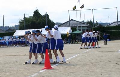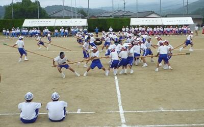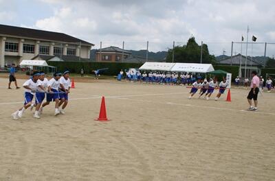 全校団技の綱引き。人数調整のために、半渡町長が青団に加わってくださいました。お互いに1勝をあげ、決勝では僅差で青団が勝ちました。