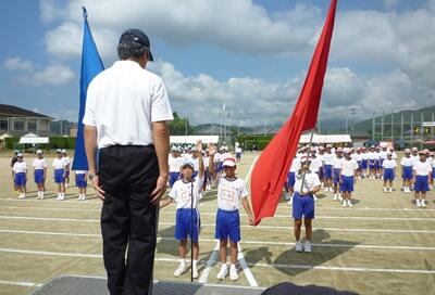 青団団長の永澤君と赤団団長の大橋君が、力強い選手宣誓をしてくれました。校章旗を先頭に、昨年優勝の青団からの入場行進です。両団とも、声も出ていて、手もよく触れている、元気のよい素晴らしい行進ができました。