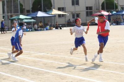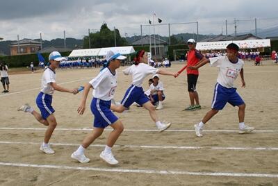 プログラムの最後、全校選抜の対団リレーです。大接戦になり、アンカーの3年男子までもつれ、最終的に青団の逆転勝利となりました。