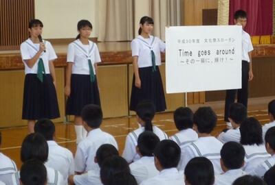 本日の朝は全校集会を行いました。表彰、生徒会役員選挙の候補者についてのお知らせがあり、最後に、文化祭実行委員会から、今年の文化祭のテーマが発表されました。