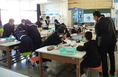 本日は、県と町の教育委員会の先生方においでいただき、本校の授業の様子を見ていただきました。写真は2年の理科の授業で、電圧と電流の関係を調べる実験をしているところです。