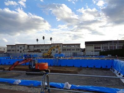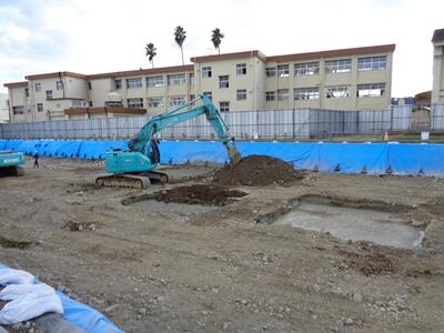 工事現場に入る機会がありました。いつも校舎3階からしか見ていなかったのですが、実際に現場に立ってみると、新校舎の大きさを実感することができました。どの程度掘り下げて基礎工事を行っているかもよく分かりました。