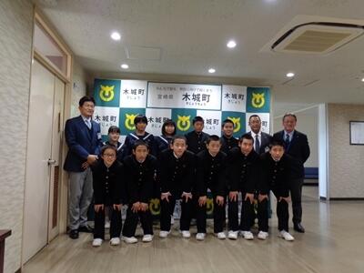 税に関する作文コンクールで、2年生の篠原さんが県租税教育推進中央協議会会長賞銅賞を、德田さんが西都・児湯地区租税教育推進協議会会長賞銀賞を受賞しました。また、県中学校秋季体育大会の柔道競技では2年生の綾部さんが階級優勝、男子団体3位、体操競技で1年生の松元君が個人総合第3位という好成績を収めましたので報告に行きました。木城中生は「文武両道」でがんばっています。