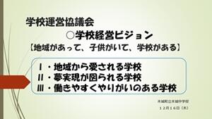 本年度2回目の学校運営協議会が開催されました。今回は授業参観とこれまでの学校での取組についての説明を行いました。委員の皆様から、貴重なご意見をたくさんいただきましたので、3学期学校経営に活かしていきたいと思っています。