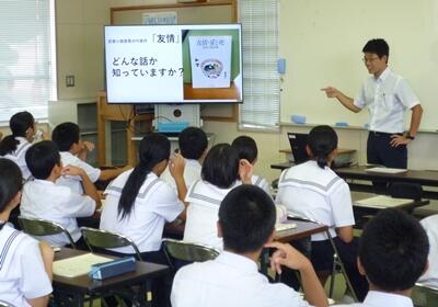 今回お話をしたのは、本校国語科の倉永先生です。実篤が木城にいた頃に書いた代表作「友情」についての紹介から始まり、いくつかの作品を通して作家としての実篤に迫るとともに、「新しき村」をつくるあたっての実篤の思いなどについて学ぶことができました。