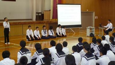 最初に生徒集会があり、各専門委員から、9・10月の取組の反省と、11・12月の目標と取組についての説明がありました。写真は学習委員会の説明の様子です。