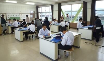 本日の2校時、1年生を対象に県英テストが行われました。これは、県内の中学校で一斉に行われるもので、英語力がどの程度身に付いているかを確かめるためのテストです。写真は、テストに真剣に取り組む1年A級の生徒たちの様子です。