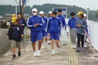 最初に、グラウンドに集まり、JRC委員長の大山君からあいさつと諸注意がありました。このあと、小中縦割りで、14の班に分かれて活動しました。