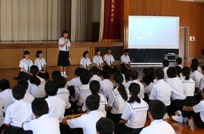 次に、生徒会執行部から、防災ボランティアの参加についてや、あいさつをよくする取組であるA1グランプリについて、ペットボトルキャップやアルミ缶回収の取組についての説明がありました。