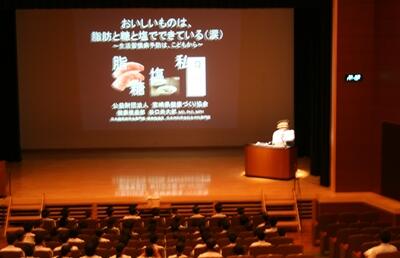 参観授業の後は、リバリスに移動して、学校保健員会を実施しました。県健康づくり協会の医師、谷口尚太郎先生においでいただき、「生活習慣病の予防はこどもから」をテーマに、講演をしていただきました。(会場が暗くて写真がぶれてます。こめんなさい)