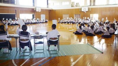 本日の午後、年に1回の生徒総会が行われました。生徒総会は、木城中がよりよい学校、生徒にとって生活しやすい学校にするためにどうすればよいかを、生徒が主体となって話し合うものです。全校生徒が集まって、体育館で行われました。