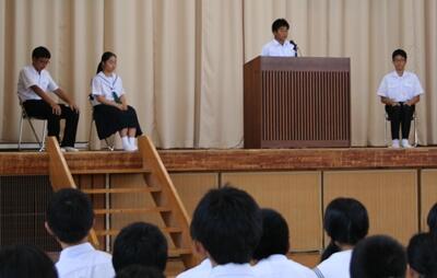 始業式では、1年の林君、2年の原さん、3年の海野君、生徒会執行部から大山君が、代表で2学期の抱負を述べました。写真は、原さんが発表しているところです。