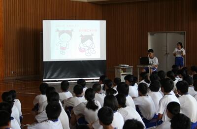 全校集会では、校長の話の後に、保健体育委員会から、熱中症の予防と対応について話がありました。プレゼンを使ってとても分かりやすく説明してくれました。