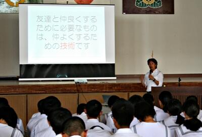 本日の午後、全校生徒を対象に、ピア・サポートネットワーク講演会を実施しました。本県では、生徒がお互い支え合い、一人一人が大切にされる学校づくりのために、ピア・サポート活動を推進し、本校は昨年度からその推進校に指定されています。本日は、九州保健福祉大学の前田直樹先生においでいただき、「中学生の対人関係とコミュニケーション」というタイトルでお話をしていただきました。