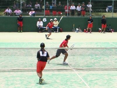 西都原運動公園のテニスコートでは、ソフトテニス女子の試合が行われました。写真は新田中との団体戦の様子です。