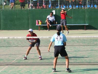 6月11日。ソフトテニスは個人戦の予定でしたが、午前中は、雨のため開始時間を5時間送らせて、午後からのスタートとなりました。写真は2回戦で妻中と対戦している様子です。