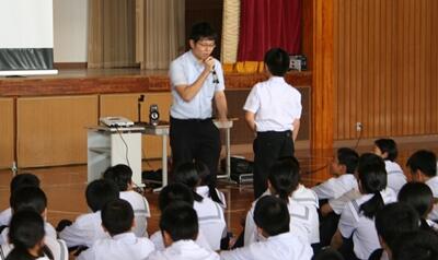 写真のように、クイズ形式で生徒に質問し、発表してもらいながら進めていただいたので、子どもたちも積極的に参加することができました。