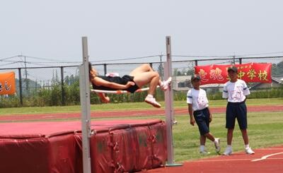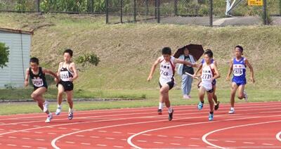 上の写真は走り高跳びに出場し、優勝した鈴木さん。下の写真は、2位に入った男子の低学年リレーでの最終コーナーのバトンパスの場面です。1年生の南村君、森竹君、2年生の小野君、高山君が出場しました。写真の一番左が木城中です。いずれも県大会出場を決めました。