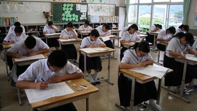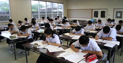 写真は理科のテストに取り組む、3年B級の生徒たちの様子です。