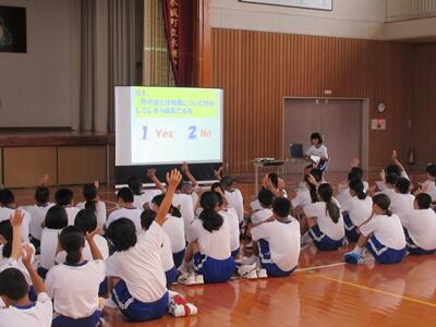 9月13日(金)の朝の時間、本校の保体・給食委員会の生徒たちが木城小学校に行って、熱中症予防教室を行いました。これは夏休み中の登校日に中学生に向けて行ったものと同じ内容で、熱中症の怖さやその予防のために注意することなどを発表してくれました。