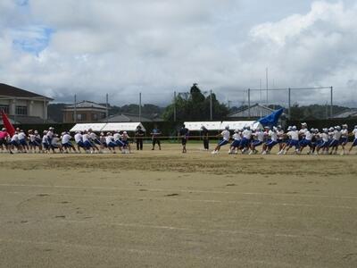 今日は体育大会の予行練習を行いました。昨夜降った雨の影響でグランドに水たまりがあったので、1・2時間目は体育館で行いました。開・閉会式やダンスの練習をしている間に先生方にグランドの水抜きをしていただきました。そのおかげで3・4時間目と午後からは、グランドで予行を行うことができました。グランドでは、学年団技や全校団技の綱引きをしました。